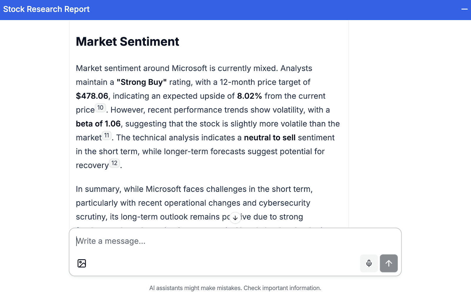 In this example, the Website Chatbot outputs a report about Microsoft’s stock price.