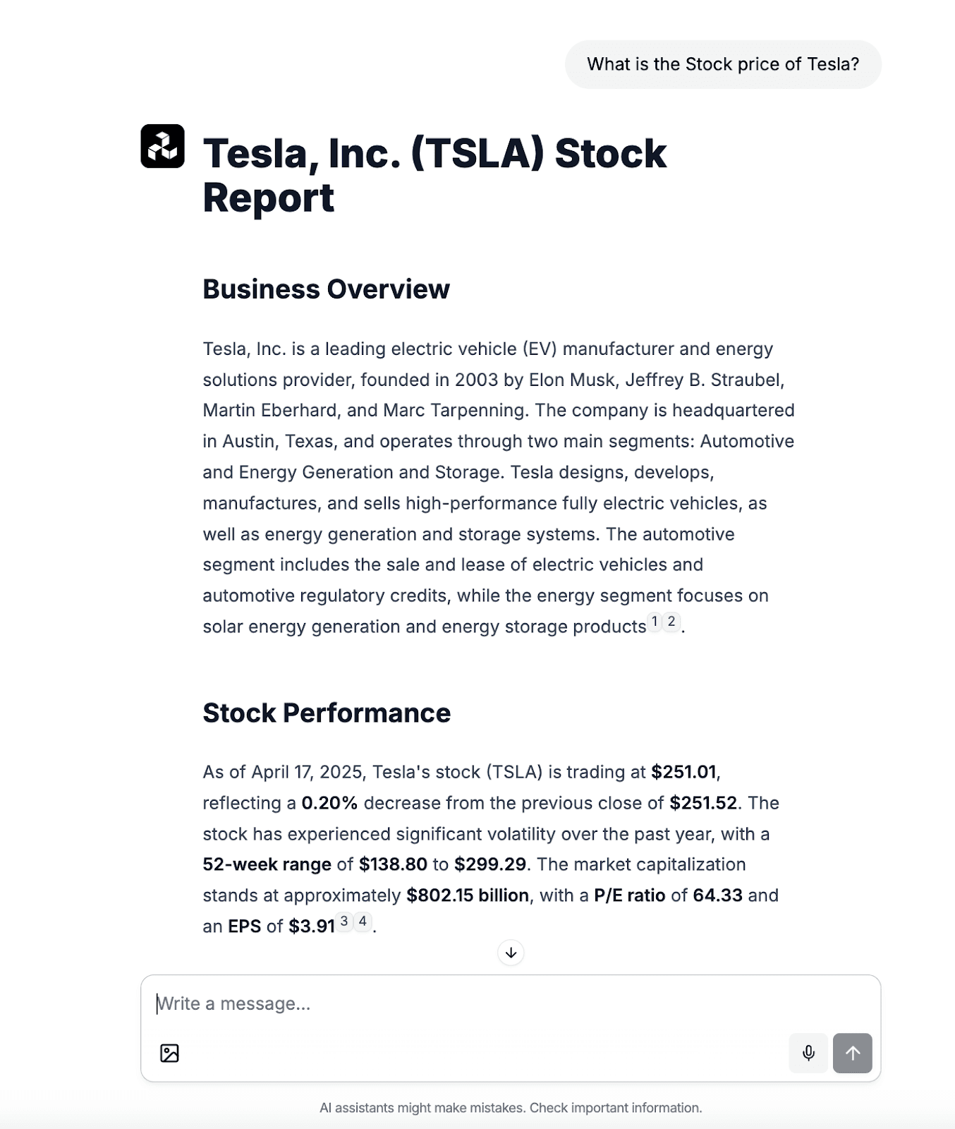 Chat Assistant will output answers, in this case reporting on the stock price fluctuations of Tesla.